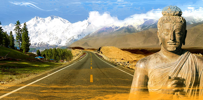 در طول ۱۳۰۰ کیلومتر، کوههای عظیم هیمالیا، کاراکورام و هندوکش در دو سوی شما امتداد دارند.