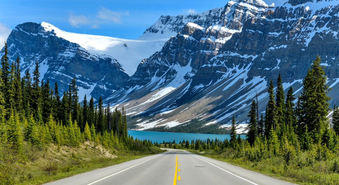 چپ و راست جاده، کوههای راکی سر بر افراشتهاند و در میانه، دریاچههای فیروزهای با یخچالهای طبیعی در افق دیده میشوند.